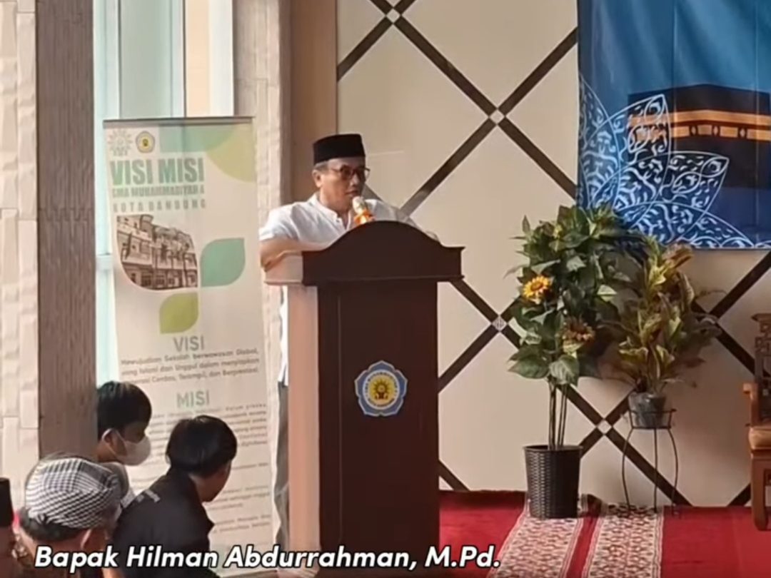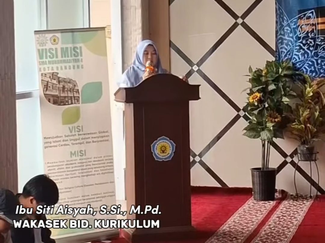 Wakasek Bidang Kurikulum, Ibu Siti Aisyah, S.S., M.Pd., mengatakan, “Saya sampaikan ucapan permintaan maaf dari bapak Kepala SMA Muhammadiyah 4 Kota Bandung, beliau tidak bisa hadir dalam kesempatan kali ini dikarenakan sedang sakit, semoga beliau disembuhkan dari sakitnya”